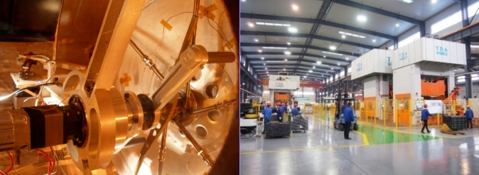 左:太空舱门开关操作变胞机构测试装备获得国家技术发明二等奖。右:航空整体薄壁结构件智能成形技术及成套装备获得国家技术发明二等奖、天津市科技进步一等奖。