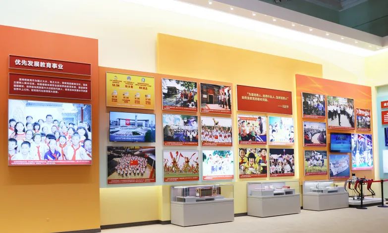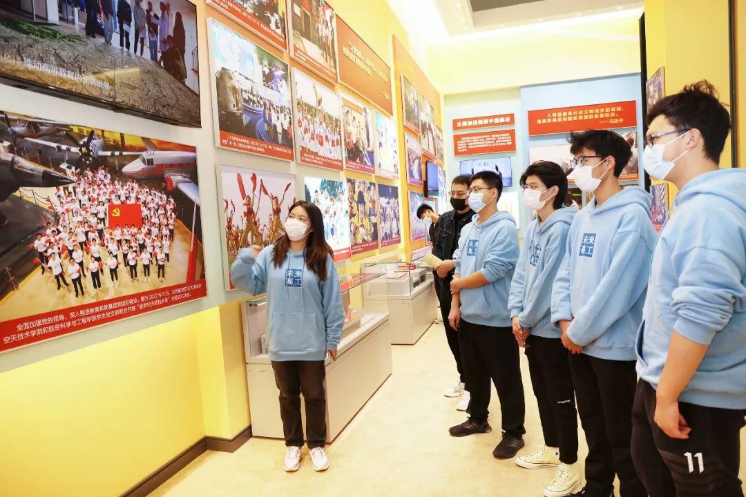“优先发展教育事业”板块展示了我国在新时代这10年,坚持把教育作为国之大计、党之大计,贯彻党的教育方针,落实立德树人根本任务,构建德智体美劳全面培养的教育体系,推进教育强国建设,培养担当民族复兴大任的时代新人,教育总体发展水平跃居世界中上行列,教育现代化取得重大进展的系列成就。展示墙上,师生们看到了北航未来空天技术学院和航空科学与工程学院学生党支部联合开展“逐梦空天 领航未来”主题党日活动的生动场景。