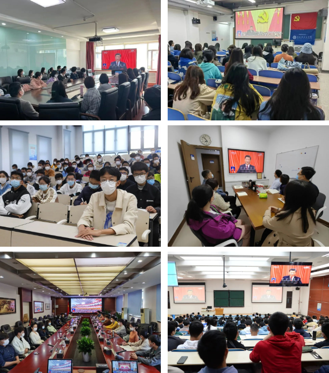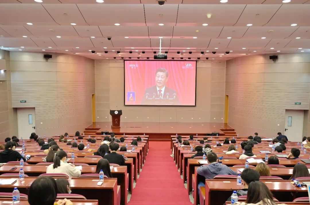 我?;渴?,在学院路校区晨兴音乐厅、新主楼第一报告厅和沙河校区咏曼剧场同步设置直播会场,组织全体在校校领导、处级干部,马克思主义学院教师、专兼职辅导员及党员师生代表共800余人集中观看。