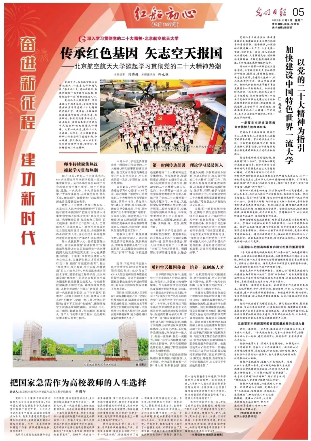 《光明日报》红船初心专刊2022年11月1日整版报道北京航空航天大学深入学习贯彻党的二十大精神,刊发校党委书记赵长禄署名文章《以党的二十大精神为指引 加快建设中国特色世界一流大学》:
