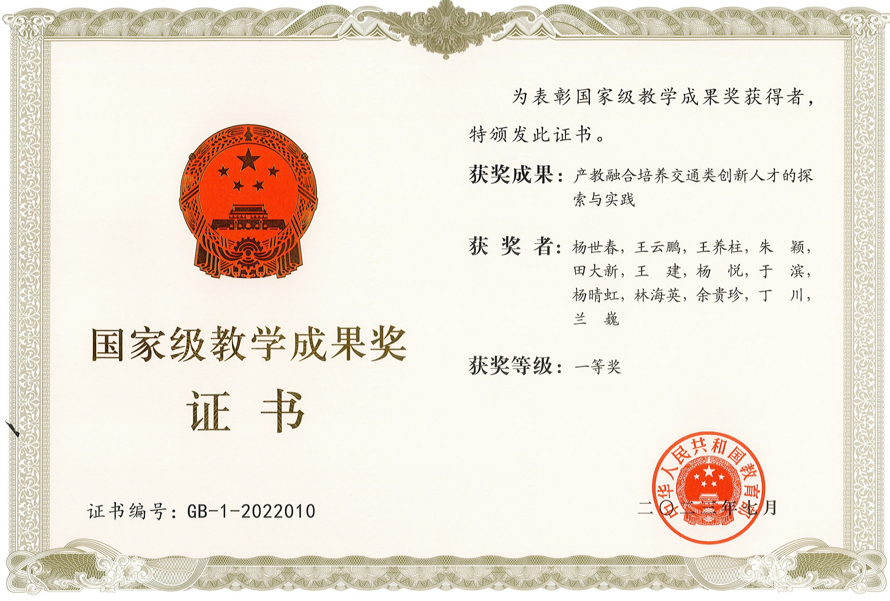 2022年,杨世春教授作为第一完成人的项目“产教融合培养交通类创新人才的探索与实践”获国家级教学成果一等奖,这是学院的第一项国家教学成果奖。围绕交通强国建设试点任务“综合立体交通两领人才培养模式试点”,改革人才培养模式,加快培养国家急需高层次人才、基础研究人才、卓越工程师等,打造了交通类人才培养的“北航范式”,构建了专业教学与思政教育有机融合的课程思政体系、“三名一重”教学成果建设体系和“产教融合”交通类创新拔尖人才7C培养体系。近年来,获国家级教学成果一等奖1项、北京市教学成果奖2项,获批国家级一流本科课程2门、行业学会/协会优秀博士学位论文5篇等,获批北京高?!坝胖时究瓶纬獭?门、主编普通高等教育本科国家级规划教材2本、北京高?!氨究平萄Ц母锎葱隆毕钅?项。联合百度打造了国内首个“自动驾驶硕士研究生培养班”,与国家智能网联汽车创新中心共建“智能网联汽车卓越工程师计划”。