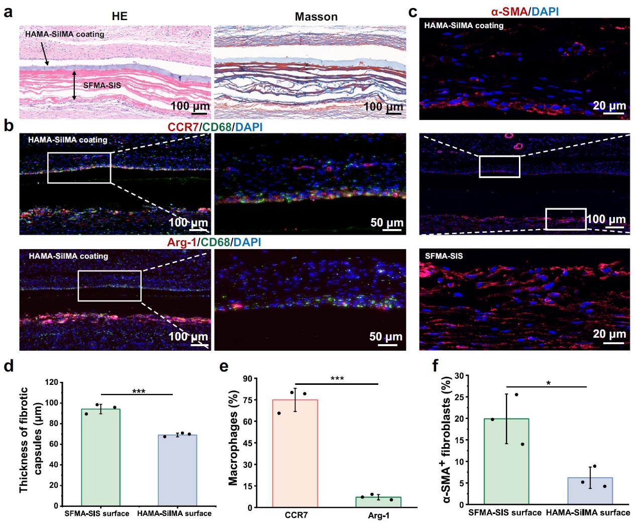 组织学评估显示(图5),在植入14天后,HAMA-SilMA涂层表面作为?;ば云琳?,与宿主组织明显分离,并有效阻止了宿主细胞和组织的侵入,从而减少组织粘连的程度。HAMA-SilMA侧的巨噬细胞显示出更高的M1表型,然而,与SFMA-SIS侧相比,HAMA-SilMA侧显示出更薄的纤维囊和更低的α-SMA阳性成纤维细胞表达。