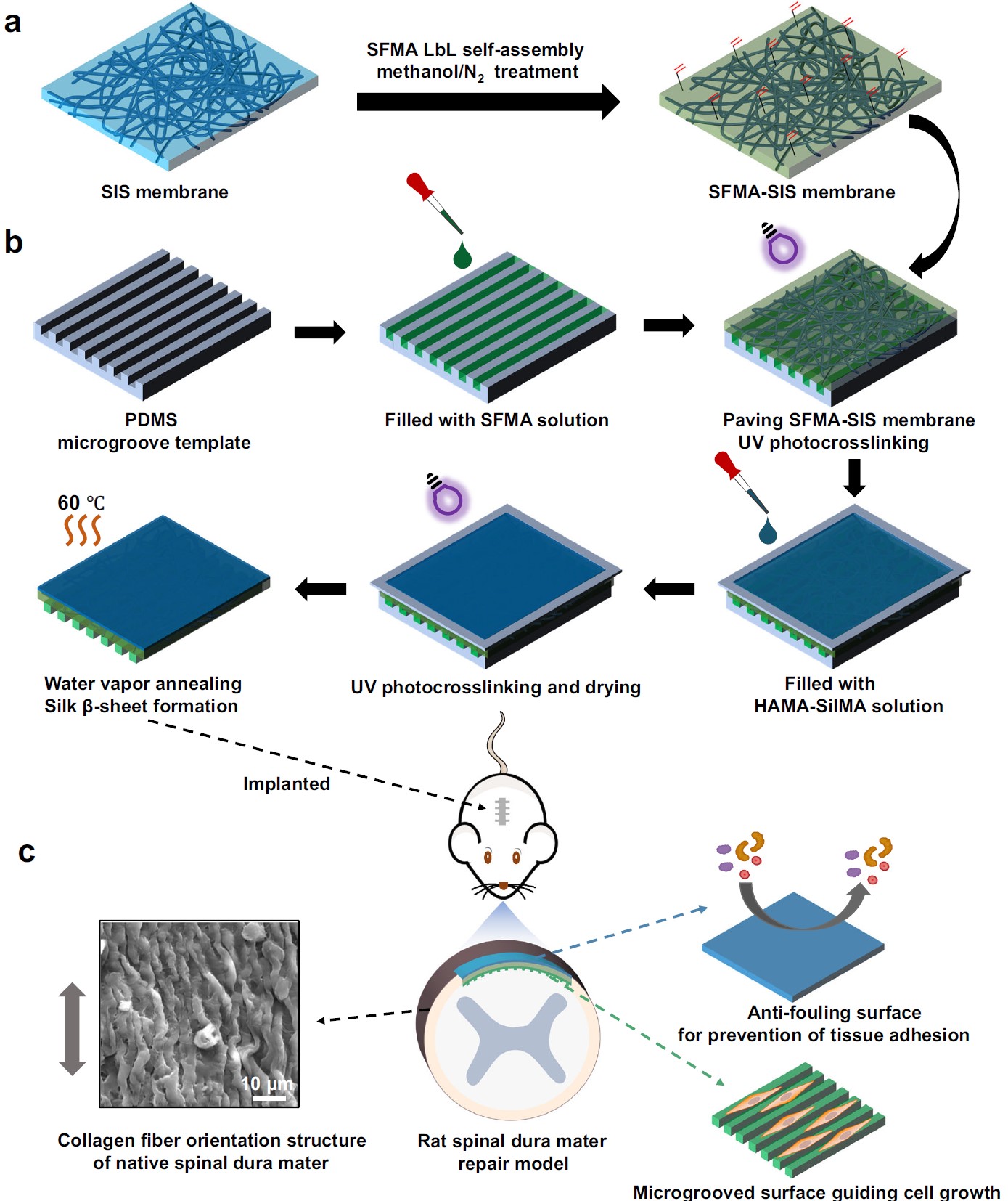 该研究开发了一种新型的Janus小肠黏膜下层(SIS)膜材料,通过在SIS表面涂覆丝素基水凝胶涂层,实现了对硬脊膜修复和防止硬膜外粘连的双重功能:内层丝素蛋白(SF)和甲基丙烯?;克氐鞍祝⊿ilMA)复合(SFMA)微沟槽涂层可引导细胞定向生长,促进硬脊膜再生;外层的甲基丙烯?;该髦仕幔℉AMA)和SilMA复合涂层则能有效抵抗蛋白吸附和细胞粘附,抑制硬膜外纤维化粘连(图1)。