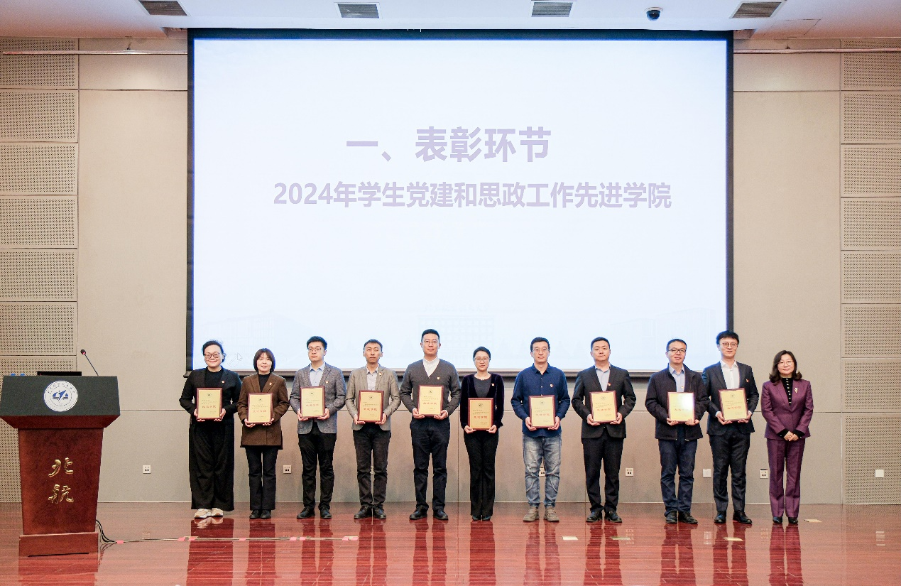 会议首先表彰了2024年学生党建和思政工作先进学院。电子信息工程学院、能源与动力工程学院、航空科学与工程学院、计算机学院、生物与医学工程学院、交通科学与工程学院、宇航学院、沈元学院、新媒体艺术与设计学院和北航学院士谔书院获奖。邓怡为获奖学院和书院颁奖。
