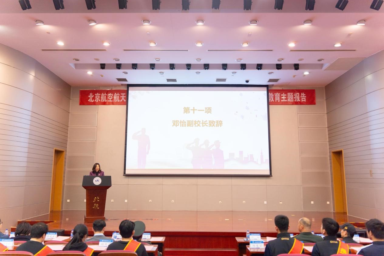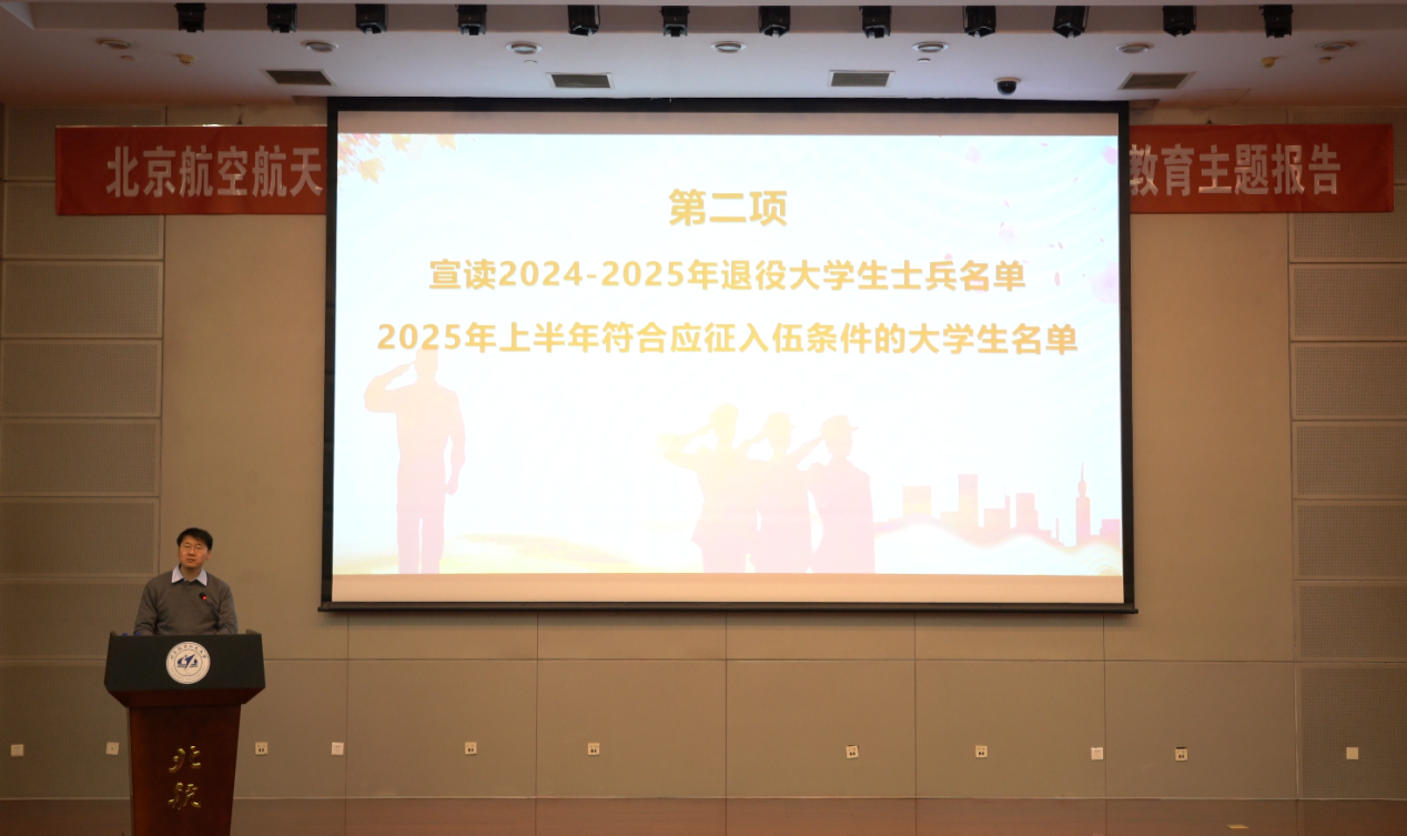 北航新闻网3月10日电(通讯员 岳巍/文 张悦/摄影)3月7日下午,我校2025年上半年大学生应征入伍欢送仪式暨国防教育主题报告在学院路校区新主楼第一报告厅举行。通州区国动办二级调研员、一级战斗英雄张茂忠,原中国人民解放军三军仪仗队国旗护卫队队长、海淀区人民武装部政治工作部中校冯开春,党委宣传部、党委武装部、教务部、学生中心、体育部、校医院及相关学院领导老师,退役大学生士兵代表,2025年上半年符合应征入伍条件的大学生参加仪式,北航副校长邓怡出席仪式并致辞。仪式由党委武装部副部长张驰主持。
