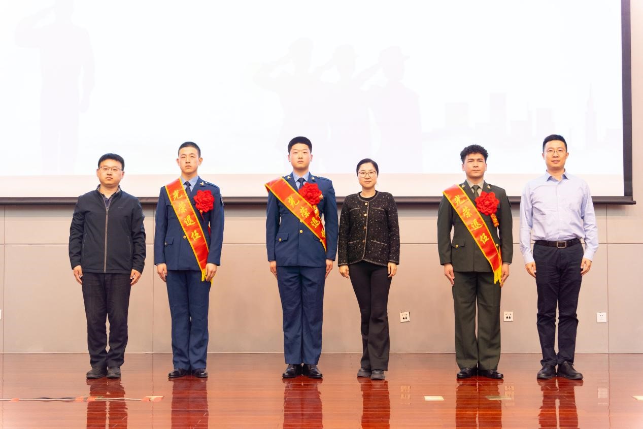 各相关学院领导老师为退伍大学生士兵佩戴绶带并赠送书籍及返校文具礼包,希望他们尽快重新融入校园生活。