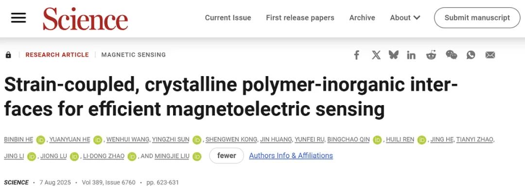 北航新闻网8月8日电(航宣)2025年8月8日,国际顶级学术期刊《Science》以在线全文Research Article形式发表了北京航空航天大学化学学院和仿生界面材料科学全国重点实验室刘明杰教授、李景教授团队与材料科学与工程学院赵立东教授团队在柔性磁电材料领域的最新研究进展:《Strain-coupled, crystalline polymer-inorganic interfaces for efficient magnetoelectric sensing》。该研究通过界面共晶策略成功制备了一种高性能聚合物-无机纳米复合薄膜,为柔性磁电材料的设计与应用开辟了新路径。研究团队通过对铁磁性二硒化钒(VSe?)单层表面进行重氮化修饰,从而在铁磁性纳米片与铁电性高分子聚偏二氟乙烯(PVDF)之间构建了亚分子级平整的界面结构。这种高度结晶的复合界面有效抑制了能量耗散并提高了界面能量传递效率,最终制得的复合薄膜展现出卓越的磁电性能——磁容系数高达23.6%,且具备超快磁电响应速度(1 ms-1)。值得关注的是,该器件实现了与热电器件的交叉集成,所制备的集成器件展现出长时稳定的信号输出特性,为小型化、多功能化可穿戴设备的创新发展提供了全新设计策略。博士生何彬彬为第一作者,刘明杰教授,赵立东教授,李景教授为通讯作者,北京航空航天大学为第一单位。