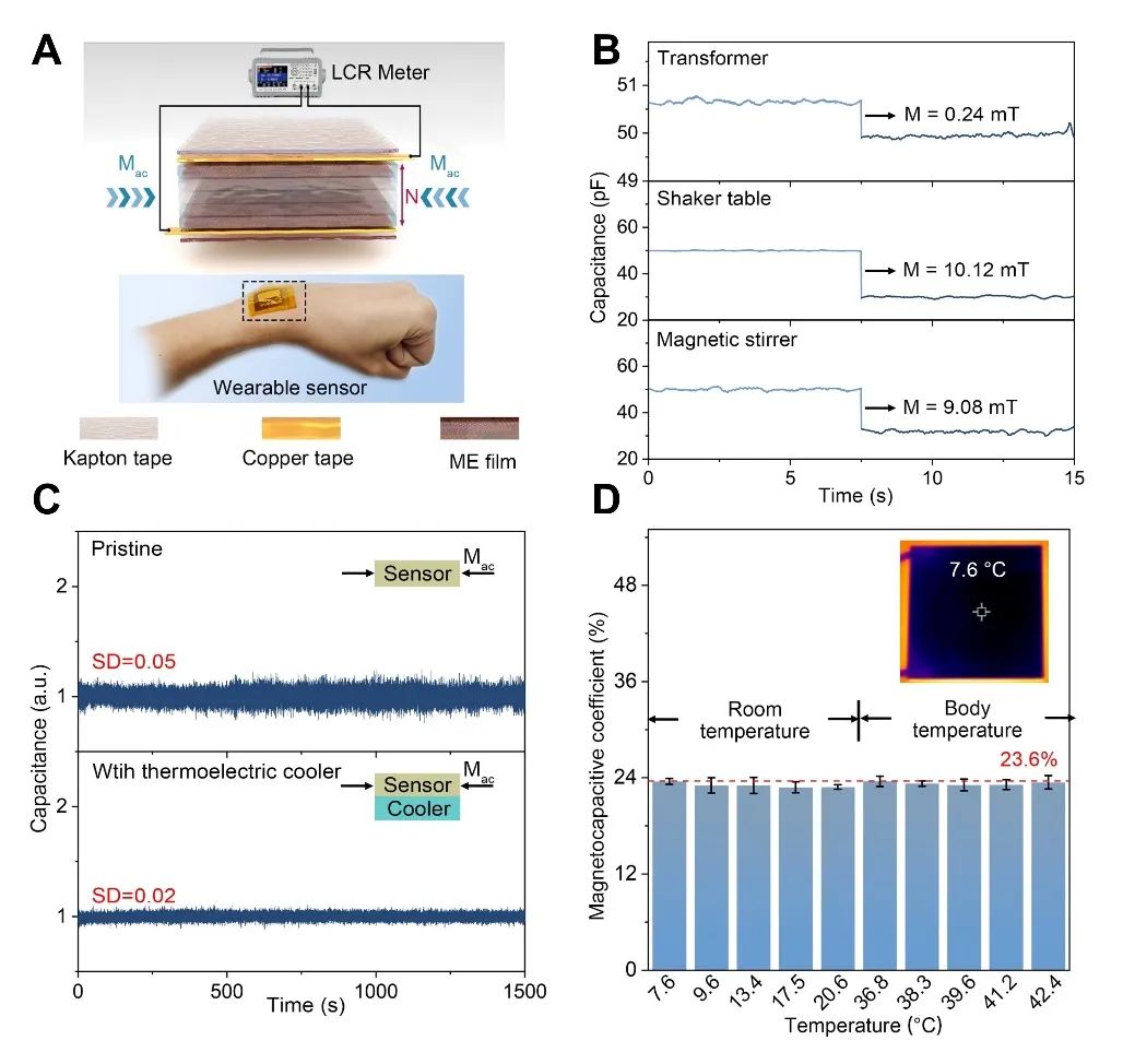 基于该薄膜优异的磁电耦合特性,研究团队进一步将其制备为可穿戴磁电传感器。实验表明,该传感器具备柔性可穿戴特性(图3A),能够实现对环境磁场的实时监测(图3B)。当与热电冷却??榧珊螅ㄍ?C),传感器测量标准偏差由初始的0.05降低至0.02,稳定性大幅提升。此外,基于热电器件辅助的宽温域测试(覆盖室温至人体体温区间)结果表明,磁容系数在全温程范围内保持高度稳定(图3D),有力验证了其在复杂环境场景下的可靠工作性能。