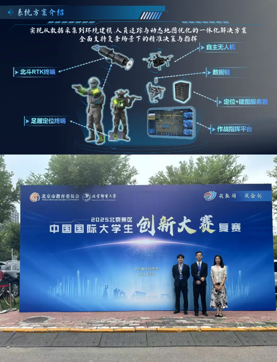 项目简介:本团队设计的建图及定位系统融合搭载视觉传感器、IMU的无人机设备以及足履定位终端,兼具人机协同、自主定位两大优势。无人机进入未知环境后,利用视觉SLAM和全局感知模型构建初始三维地图并恢复地图尺度,上传至系统。人员进入环境,通过多源融合定位技术获取实时位置,利用三维地图修正定位误差并显示在系统中,根据人员位置和环境特征,规划无人机二次飞行路径。无人机采集新数据,利用增量式地图构建技术更新地图,将更新后的地图与人员定位信息实时同步至系统。系统实时显示地图和人员位置以支持决策,通过人机协同,动态调整计划。