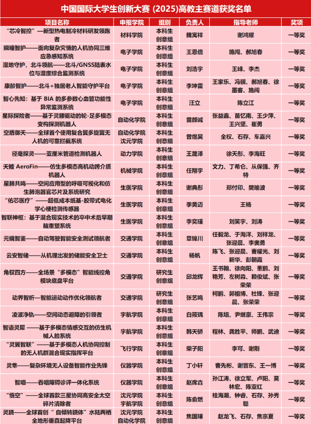 北航新闻网8月20日电(航宣)日前,2025年中国国际大学生创新大赛北京赛区现场决赛落下帷幕,北京航空航天大学共有805名参赛学生、294名指导教师获奖,共计获得33项一等奖、23项二等奖、39项三等奖,获奖人数创历史之最,一等奖数量与获奖项目总数再创新高。在大赛主赛道中,北航共获28项一等奖,获奖数量为北京市第一,其中5个项目进入冠军争夺赛(北京市主赛道排位赛前20名),入选数量北京市第一,为我校历年最多。最终,本科生创意组3项作品包揽该组别北京市前三名,研究生创意组1项作品获该组别北京市第二名。