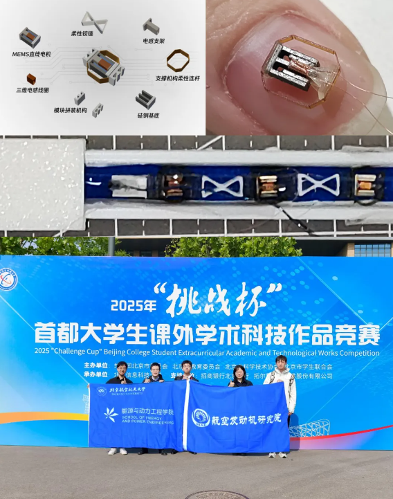 项目简介:项目团队以MEMS(微机电系统)技术为基础,深度融合??榛瞪杓朴胫悄芸刂扑惴?,设计制作了一种微型管道机器人,实现“微型、多用、可靠”三大突破,用精巧身形承载强大功能,为发动机油气管路检测等狭小空间检测难题送上破局利器。全机截面尺寸2*4mm以内,可以进入常规管道机器人难以进入的微小尺度管道;首创模块串联式机械架构,支持多级串联与集群协同作业??捎τ糜诟丛泳芗觳?、狭小空间侦察、城市末端管路检修维护等多种领域。