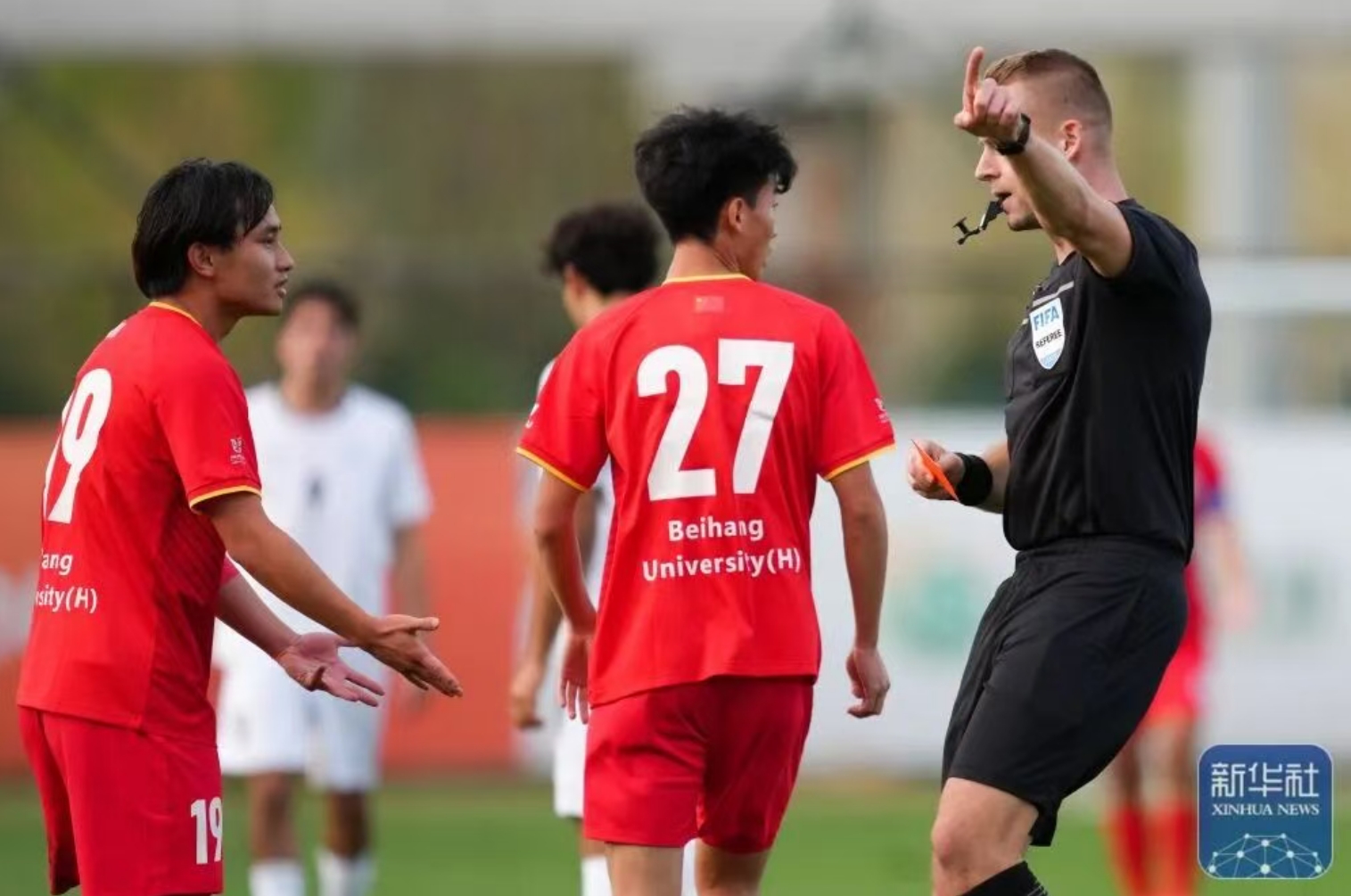 主裁判向北京航空航天大学男足球员林扬(左)出示红牌。