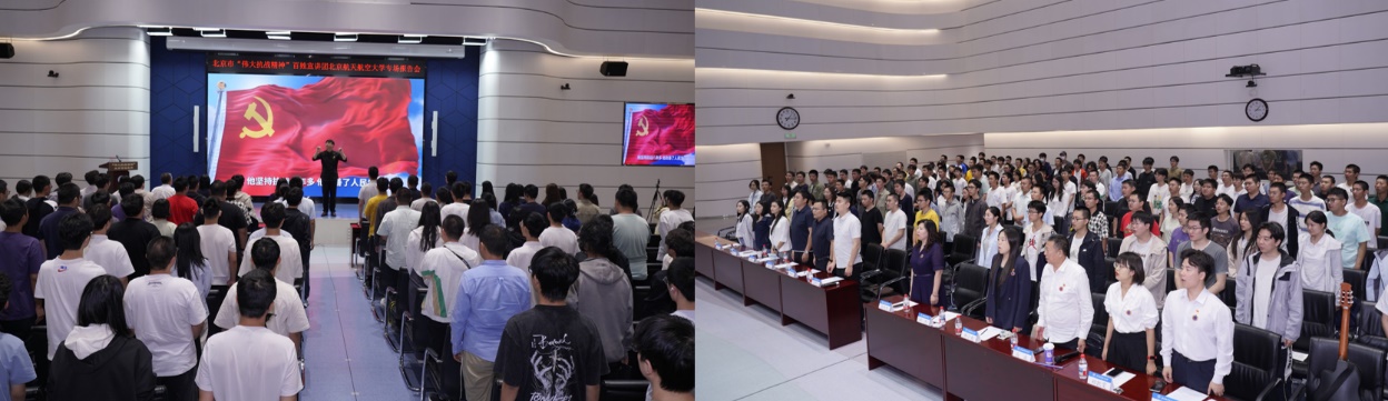 报告会特别设置了“向英烈和先辈致敬”环节,通过AI技术让英烈“穿越”见到今日繁荣昌盛的祖国,深刻诠释了“我若记得,你便活着”的精神传承。随后,门头沟区委党校教师张董带领全场师生高唱《没有共产党就没有新中国》。这首诞生于烽火岁月的战歌,唱出了北航学子“永远跟党走”的坚定信念,唱出了“航空报国”的青春志向,唱出了“强国有我”的爱国豪情。激昂嘹亮的歌声响彻会场,展现了新时代青年炽热的爱国情怀,将现场气氛推向高潮。