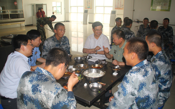 张军副校长一行观看了2013级国防生进行匍匐前进等战术训练,并代表学校向全体学员表达了最亲切的问候和关心,鼓励同学们要能吃苦、能战斗,培养出国防生应有的精气神,以饱满的精神风貌、良好的纪律作风、过硬的综合素质,为全体北航学生树立学习的榜样。随后,慰问团参观了军训学员宿舍及食堂,并与全体学生一同在食堂就餐。用餐过程中,张军副校长不时询问身边的同学,是不是能吃饱、是不是睡得好,同时教导同学们要不畏困难,勤奋刻苦,努力训练,为祖国的国防事业贡献自己的力量。