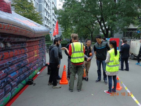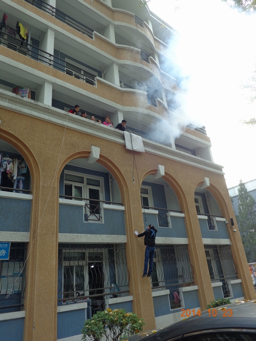 此次演练得到校外合作单位、国际消防志愿者进行积极配合和支持。现场活动分两部分进行:一是电子灭火器的使用培训,现场由国际消防志愿者成员手把手、按步骤教没有体验、没有使用过灭火器的学生,掌握如何在初期火灾时及时使用灭火器灭火过程;二是公寓楼逃生自救演练,由专业的消防工作人员进行现场示范,并指导学生志愿者及学生代表从较高楼层用逃生绳缓降落地。