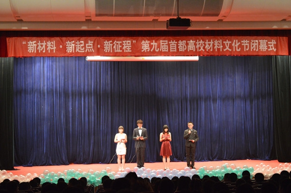 闭幕式上,各学校同学带来了精彩纷呈的才艺表演,火辣奔放的开场舞将现场气氛瞬间带入高潮;来自清华大学同学的琵琶独奏让现场观众如痴如醉,曲声时快时慢,忽而急促忽而平稳,技艺十分高超;来自我校同学的手语舞蹈《星语心愿》美轮美奂,一位位身着白色长裙的女同学舞动着,犹如一位位天使翩翩起舞;北京理工大学同学为大家带来了精彩的魔术,普通的纸牌似乎有了灵性,完全听从了魔术师的指挥,让现场的观众见证了奇迹时刻;来自我校的二胡独奏《青花瓷》精彩绝伦,同时还有两位才女分别写一幅字和剪纸,身着复古长裙女生游龙戏凤的笔法和穹劲有力的“六秩材苑有栋梁,万千学子谢师恩”赢得了阵阵掌声;来自北京工业大学同学的改版《青花瓷》歌词贴切材苑科研与生活,唱出了材料人的心声;来自北京科技大学的同学为大家带来了欢快的交际舞蹈,三对男女舞者用灵动的舞步与身形深深吸引了现场的观众;来自北京化工大学的学子带来了一场美丽的舞蹈,美不胜收;来自北京工业大学的男生独唱给大家带来了很多欢乐,声音如同天籁,响彻整个大厅。
