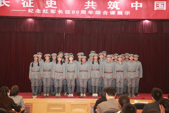 活动是从历史老师对长征历史的背景介绍开始的,同学们对长征原因的认识逐渐清晰;地理老师从自然科学的角度让同学们对艰苦恶劣的草地雪山如临其境;在政治老师的引领下,同学们对长征精神深入理解,联系自身,指导实际;老师们的精彩讲解赢得了在场师生的热烈掌声;课本剧《草》的表演感人至深;语文组的朗诵表演更是令大家领略了文学的艺术魅力。音乐老师指导演唱的红色歌曲《映山红》《闪闪的红星》歌声悠扬,红星花海交相辉映。在整个活动过程中,同学们秩序井然,认真聆听,用心学习,真情投入。本节综合课将人文、自然、艺术知识融入到语文教学中,学生们在学习情境中扩展了知识,思想感情、道德情操也得到了升华,这一教学设计令观摩的老师们大加赞赏。演出结束后,闫顺林主任情不自禁地登台朗诵了一首《七律·长征》,并对此次综合课展示活动给予了高度评价。
