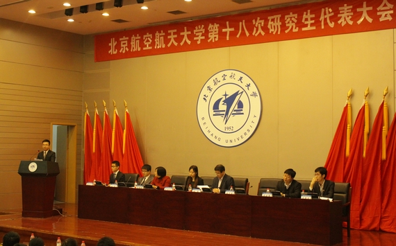 大会在雄壮的国歌声中拉开帷幕。中华全国学生联合会执行主席杨子强和北京市学生联合会主席巴思齐分别代表中华全国学联和北京市学联发表了热情洋溢的致词,他们对第十八次研究生代表大会的胜利召开表示祝贺。清华大学研究生会主席吴锦鹏代表兄弟高校研究生会致辞,表示作为兄弟高校,将一如既往地加强与北航的协作与互动,积极支持北航的建设与发展,携手并进。随后,全体代表听取并审议了校研究生会主席刘侃代表第十七届研究生委员的工作报告,报告系统地对两年来北京航空航天大学研究生会的工作进行了总结,并对未来研究生会工作提出了新的思考和建议。张军副校长代表学校党委行政对第十八次研究生代表大会胜利召开表示祝贺,表示学校对第十七届研究生会的工作和取得的成绩是非??隙ǖ摹KM氯窝谢岢稍币芄蝗锨迳砩系8旱脑鹑?,对自己高标准、严要求,在做好学生工作的同时,兼顾专业和文化学习,要能成为研究生群体中的榜样。