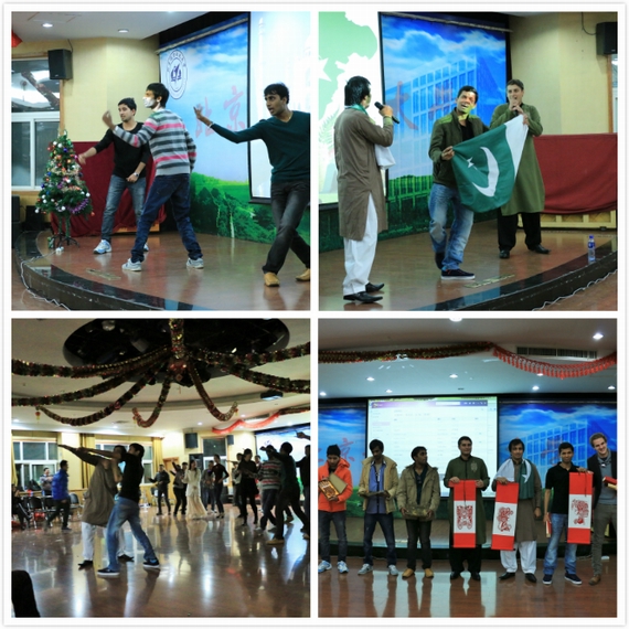 本次环球之旅共分三站:法国,印度,巴基斯坦。首先,法国帅哥Arnold向大家介绍了法国的饮食文化,讲解时,他将随身带着的法国面包baguette分给大家,让同学们在互动中更加接近法国文化。之后,同学们随主持人踏上了印度的国土,在印度友人Advit对自己的国家语言文化进行简要介绍之后,Ramana,Murali和Krishna的印度舞蹈让大家充分感受到印度的热情活力。表演期间,一些穿插其中的小游戏使得气氛更加活跃,不仅让留学生了解中国流行游戏,更增加了各国文化之间的融入感。最后,来自巴基斯坦的Rooman和Asif身着本国传统服装,通过自由洋溢的歌曲加舞蹈将整场show推向高潮。在国际伙伴的邀请下,中国学生们一同上台,与外国友人随着动感的音乐舞动起来,将文化秀变身为靓丽的国际大party,并在轻松愉快、充满活力的氛围中为本次国际交流夜画上了圆满的句号。