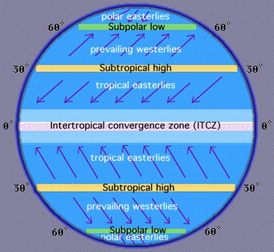 西风带是位于副热带高气压带与副极地低气压带之间(大致在南北纬35至65度之间)的行星风带。副高向副极地低压散发出来的气流在地转偏向力的作用下,偏转成西风(北半球为西南风,南半球为西北风),因此西风是在西风带的盛行风。而南纬40—60度之间几乎全部为辽阔海洋所环绕,表层海水受风力的作用,产生了一个自西向东的环流。由于常年吹刮西风,这个海区里风大浪高流急,终年浪高在5米左右。