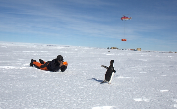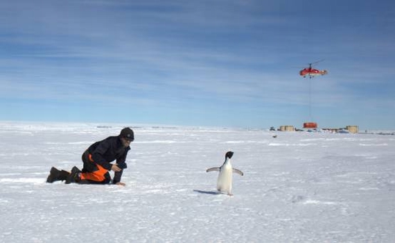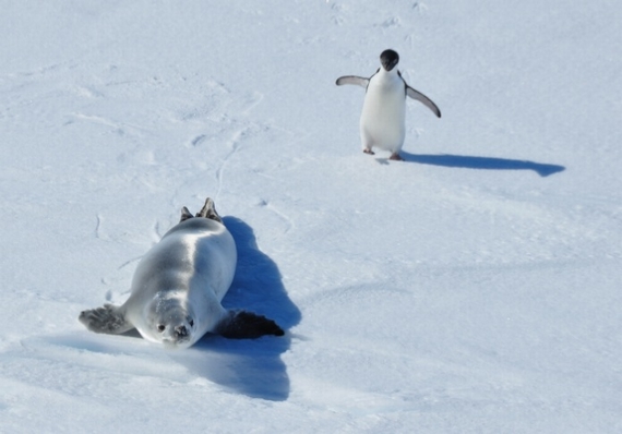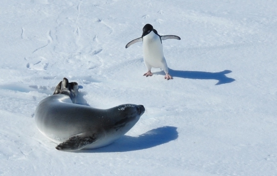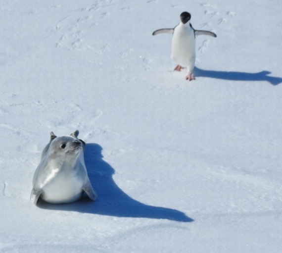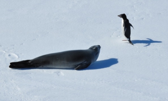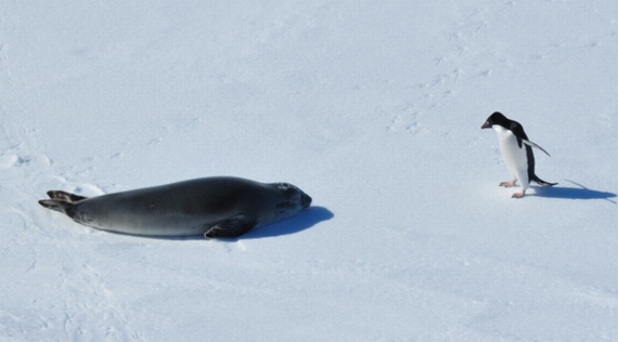 这一天我们在海冰上作业,远远看见一只小海豹和一只阿德利企鹅相遇,企鹅胆子很大,一直走到海豹边上,开始我们以为海豹要将她捕食了,但是却发生了如童话般的一幕,我想当时的对话如下: