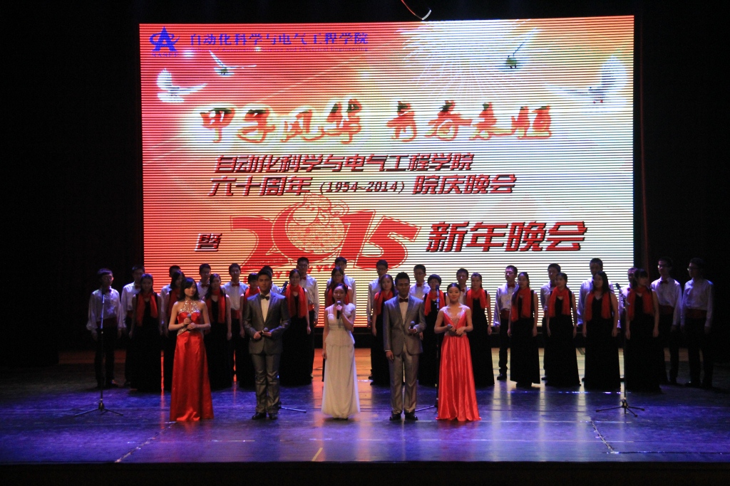 不减的气氛,不灭的高潮,自动化科学与电气工程学院六十周年晚会暨2015年新年晚会在悠扬琴声中落下了帷幕。本场晚会的选拔筹备工作历时近半年,组织了多次节目选拔、联排和彩排工作,在院学生会和各组织、个人的有效组织和高效协作下,本场晚会取得了圆满成功,成功展示了我院学生的风采和活力,彰显了学院的凝聚力与战斗力,为学院六十周年华诞送上了诚挚的礼物。