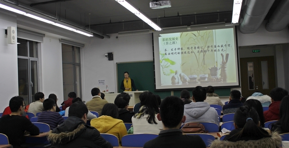 众所周知,茶,可可和咖啡并称世界三大无酒精饮料。古人云“不可一日无茶”。自古以来,中国人的生活便与茶息息相关,密不可分。周老师首先讲述了中国茶的历史。茶历史源远流长,始于春秋,盛行于唐宋,到元清得到了更大的发展。然后,周老师给大家讲述了茶的分类:绿茶,红茶,白茶,黑茶,黄茶,乌龙茶等等,以及各类茶的典型代表如浙江的西湖龙井,安徽的太平猴魁,河南的信阳毛尖等等。饮茶也跟季节密切相关,冬饮红茶,夏饮绿茶,一年四季可喝乌龙。其次,周老师详细讲述了茶道,茶艺和茶修的概念和它们之间的细微但不可忽视的区别。茶文化是包括茶叶品评技法和艺术操作手段的鉴赏以及品茗美好环境的领略等整个品茶过程的美好意境,其过程体现形式和精神的相互统一。茶道,就是品赏茶的美感之道。茶道亦被视为一种烹茶饮茶的生活艺术,一种以茶为媒的生活礼仪,一种以茶修身的生活方式。茶艺包括:选茗、择水、烹茶技术、茶具艺术、环境的选择创造等一系列内容。茶艺背景是衬托主题思想的重要手段,它渲染茶性清纯、幽雅、质朴的气质,增强艺术感染力。而茶修则是个很新的概念,茶修是介于茶艺与茶道之间的一种以茶为载体,体现茶人精神修为的茶文化活动。既追求环境、茶人的外在美,也引导茶人由外向内,觉察内心的宁静规整,和谐圆融。