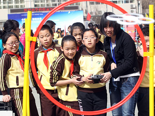 操场上的体验区内,学生们可以用??仄鞑僮菟男矸苫仙⑾陆?、悬停、转弯,努力尝试让飞机通过体验区内设置好的障碍。在另外一个区域还设置了飞行模拟器,许多学生围坐在电脑前,尝试控制飞机在空中进行特技飞行。他们边玩边学,在了解飞行器操控方式的同时,也体会到了飞行器独特的魅力。