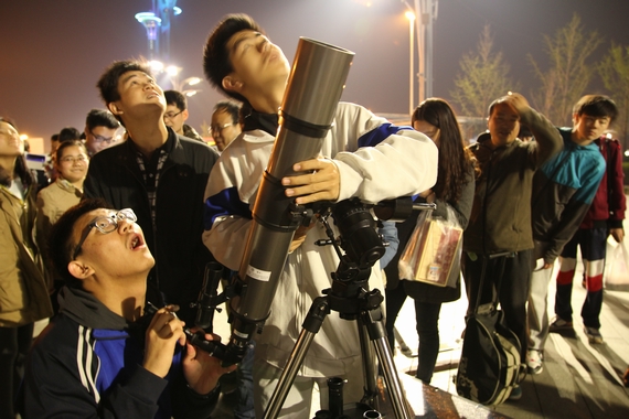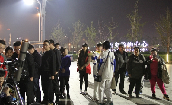 活动于晚上七点开始,北航附中和北师大三附中的同学们将组装好的天文望远镜对准金星与木星,引来大批路人前来观看,同学们借此机会向他们讲解了一些天文知识并认真回答了他们的问题。将近九点,正奔向复圆的月亮从阴云中钻出,同学们急忙调转望远镜、架好相机,并开始了月食知识的讲解。北航附中天文社的成员热情活泼,表现积极,在活动中所做的讲解、操作细致到位,得到了大家的肯定。