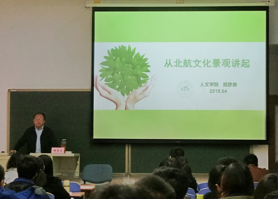 开班仪式结束后,郑彦良教授为两期学员做了题为《透过景观看北航》的主题报告。郑彦良教授作为北航成长过程的见证者、参与者和记录者,用他42年北航人的亲身经历,生动形象地为学员们讲述了北航各文化景观的特定背景和历史含义。从“栢彦庄湧寿寺遗址”到“为人民服务”牌匾,从“北京一号”、“北京二号”到校庆50周年纪念碑,从各式各样人物和艺术的雕塑到纪念校庆和奥运会的纪念封,通过对校园内各景观所传承的北航历史与文化的深入描述,郑彦良教授表达了一种“对祖国、对航空、对航天、对北航、对师生”的挚爱,道出了“爱国奉献、敢为人先、开放包容、笃行坚卓”的北航精神。学员被郑教授精彩的报告深深吸引,在报告结束后纷纷表示要去看看这些北航景观,感受其中蕴含的北航精神。
