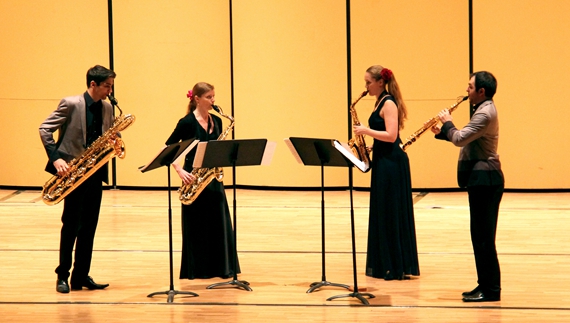 北航新闻网4月21日电(记者 王晴/文 通讯员 吴文征/摄影)4月20日晚7时,梅利斯玛萨克斯四重奏音乐会在北航晨兴音乐厅上演。梅利斯玛萨克斯四重奏由来自瑞士、丹麦、西班牙、荷兰的四位“80后”演奏家组成,自2009年成立以来在国际室内乐舞台上以极高的演奏水准赢得了世界的瞩目。2011年,他们作为第一支受邀的荷兰乐团在大阪国际室内乐比赛中获第四名,并以独特的曲目、深厚的功底和青春洋溢的舞台风格获得评委的高度赞誉。