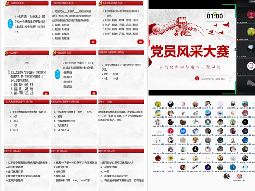 为充分发挥学生党员的先锋模范作用,展示优秀学生党员风采,为广大学生党员提供互相交流、学习和提高的平台,自动化学院研究生党支部党员风采大赛于6月24日下午2点在线上正式拉开帷幕。本次党员风采大赛以“在抗疫中成长,聆听两会之音,感恩伟大祖国”为主题,来自SY1903第一至第九党支部的9支参赛队伍分别进行了风采展示环节和答题环节。比赛答题环节由“个人风采”、“谁与争锋”、“互动环节”、以及“一站到底”组成。在比赛过程中,各组参赛选手们屏气凝神,始终保持着飞快的答题速度和高得分率。在互动环节,还抽取了未参赛的亲友团成员们进行了答题,提高现场观众参与度。通过举行党员风采大赛活动,推动了学生党员对理论知识的学习和掌握,以赛促学,学以致用,效果显著,有效提升了学习的针对性和实效性。