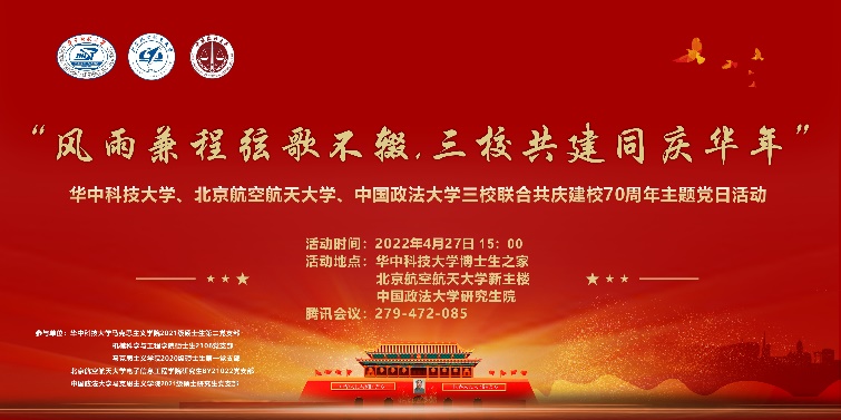北航新闻网5月7日电(通讯员 田旺)正值北京航空航天大学、华中科技大学、中国政法大学建校70周年之际,为进一步丰富党建活动形式,增强校际协同、支部共建,共迎70周年校庆,2022年4月27日下午,北京航空航天大学电子信息工程学院研究生BY21022党支部联合华中科技大学、中国政法大学,共计3所高校5个学院6个学生党支部,以线上线下相结合的形式,开展了“风雨兼程弦歌不辍,三校共建同庆华年”三校联合共庆建校70周年主题党日活动,参与活动的党员和积极分子共计200余人。