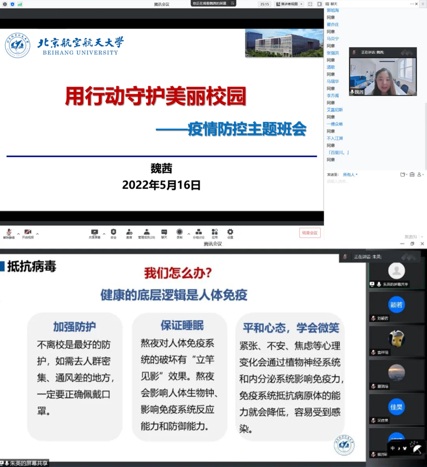 化学学院班主任、辅导员以“共克时艰,守护美丽校园”为主题面向学院全体学生召开班会,发出拒绝外卖、减少快递、守护美丽校园的倡议,将学校的暖心举措详细告知同学们。同学们纷纷表示,大爱暖心北航,要用行动守护美丽校园。