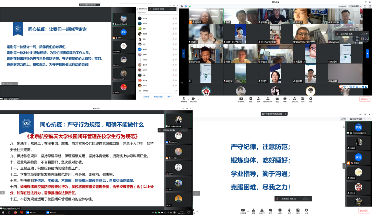 北航新闻网5月23日电(通讯员 董春雷)5月21晚至5月22日,化学学院本科班主任及研究生专兼职辅导员全覆盖召开了“抗疫有我 同心护航”主题班会。