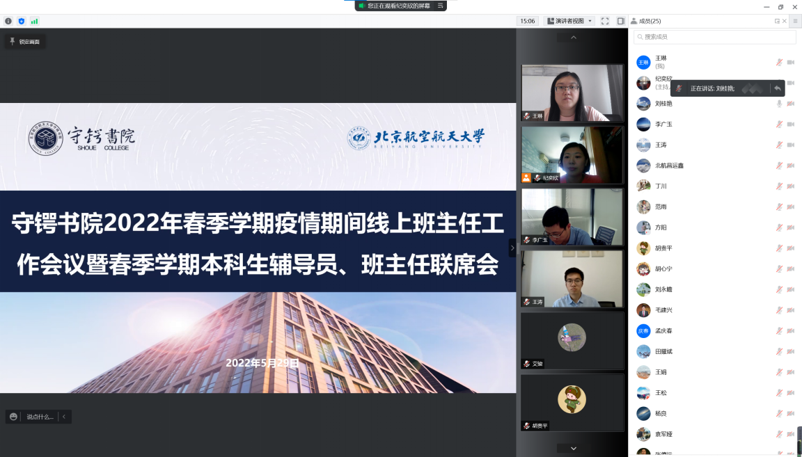 北航新闻网6月1日电(通讯员 王涛)为进一步做好书院疫情防控工作,与书院全体班主任统一思想,顺利完成学生返乡服务、学业提升等相关工作,5月29日中午,守锷书院在腾讯会议平台召开疫情期间线上班主任工作会议暨春季学期本科生辅导员、班主任联席会。