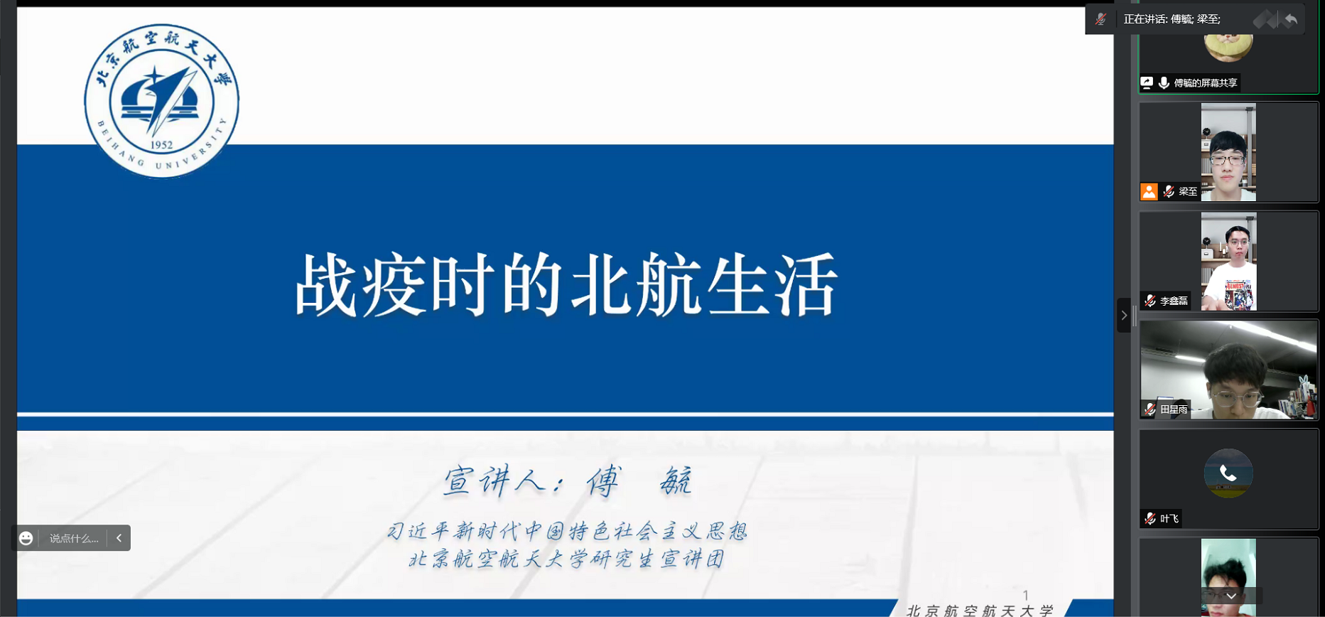 傅毓结合自身经历,从一点一滴的细节出发,为同志们展现了战疫时的北航生活和北航为抗击疫情推出的各项暖心措施。从常态化核酸,到超市降价打折,再到大运村超市的设立,这一项项举措都体现着北航战疫有力度,防疫有温度,落实有速度,“管长”、“盒饭”也成了疫情防控期间同学们的独特记忆。最后,傅毓以习近平总书记曾说的“用生活的淡定去面对问题”作总结,希望同志们能够继续大力配合学校疫情防控工作,戮力同心,携手抗疫。