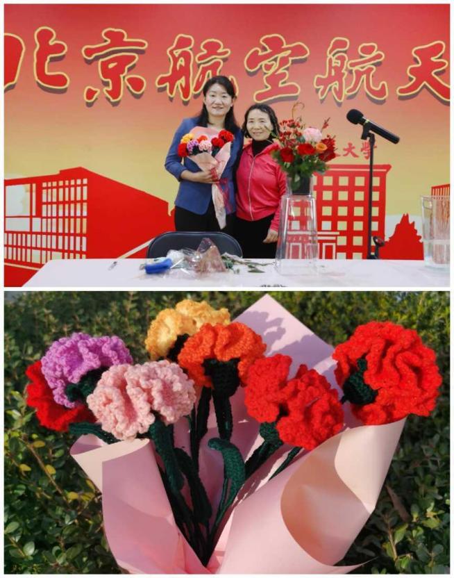 活动中,北航老年社团手工艺协会的老师特意为王丹丹老师准备了亲手制作的康乃馨花束,以表达诚挚感谢和节日祝福。
