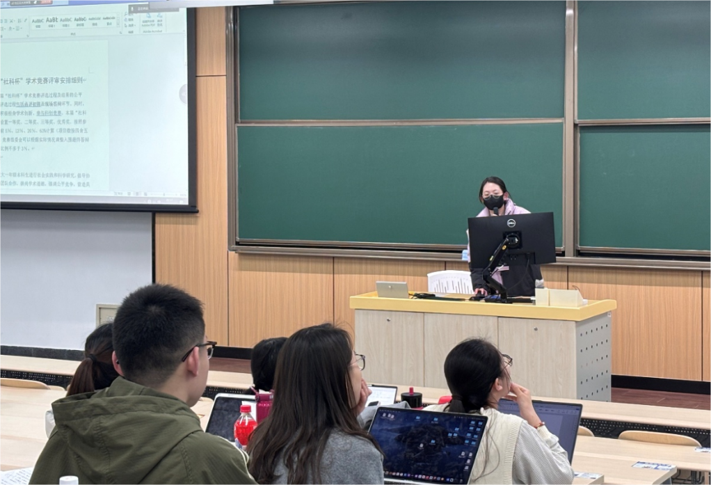 王语盈、王泺源两位学姐结合在“社科杯”“冯如杯”的参赛经历,强调框架凝练、答辩精炼与团队协作的重要性,鼓励同学们以兴趣为锚,大胆创新,并以知识产权?;ぁ⑾绱逍越逃钅课?,阐释如何通过“经典理论—现实矛盾—解决方案”逻辑链提升学术说服力。