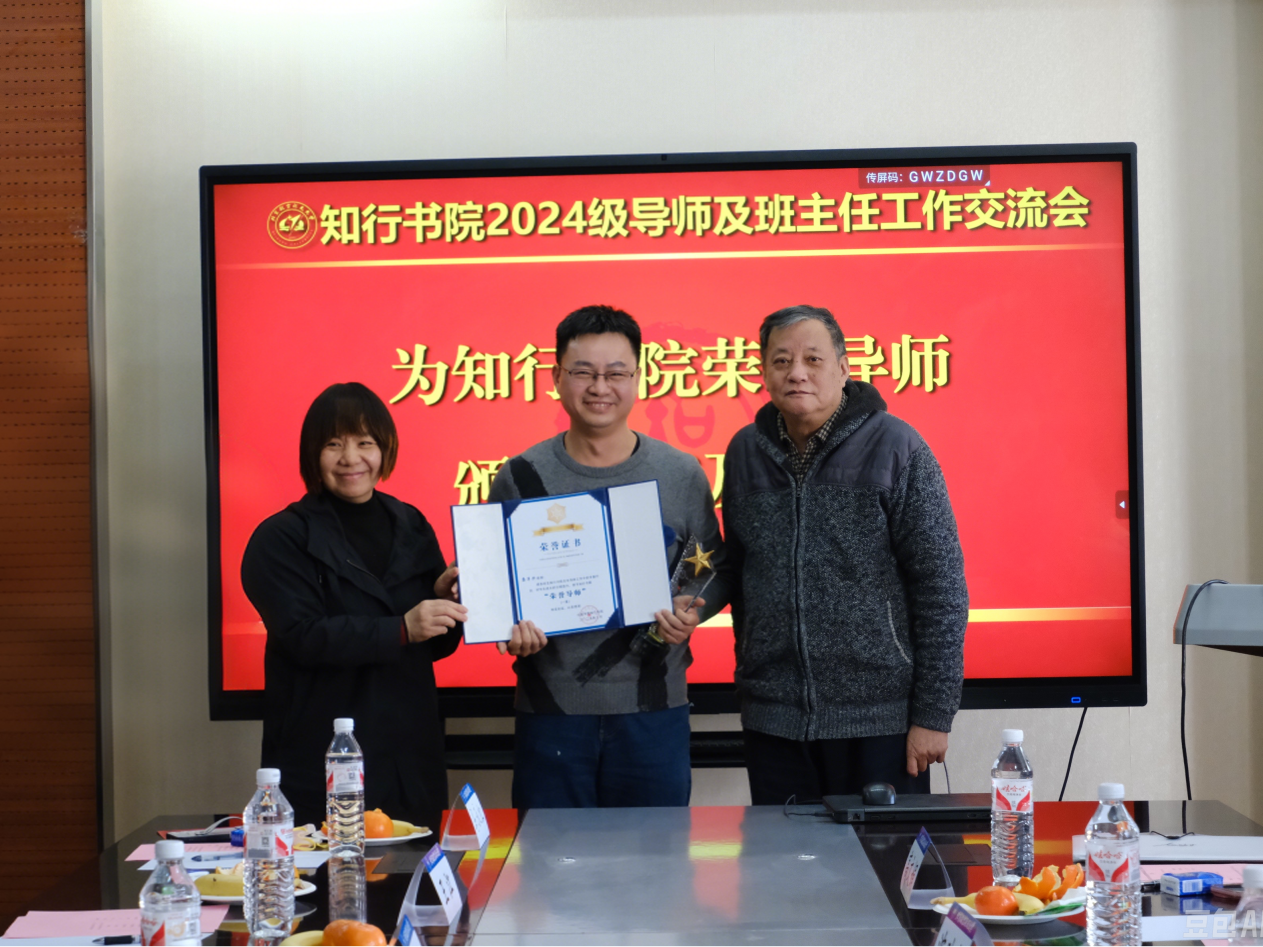随后举行了知行书院荣誉导师颁奖仪式。在书院工作满五年的导师将获评知行书院荣誉导师(一星)称号,每满五年加一星。今年,来自人文与社会科学高等研究院的康子兴老师和法学院的王天凡老师获得知行书院荣誉导师(一星)称号,书院院长郑晓齐与学业总导师沈映春为到会的荣誉导师康子兴颁发证书及奖杯。康子兴分享了自己在五年导师工作中的经验和感受,他表示导学活动可以让师生双方获得“滋养”,需以平等视角倾听学生需求,在建立深厚情谊的同时帮助学生缓解成长焦虑。