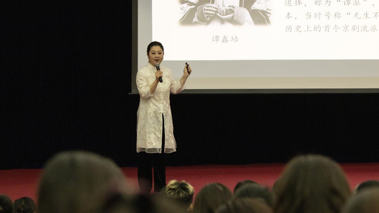 谭茗心从京剧起源讲起,结合梅兰芳、谭鑫培先生的事迹,介绍了京剧的发展历程,展示了京剧“四功”——唱、念、做、打,以及“四大行当”——生、旦、净、丑。她强调,京剧集综合性、虚拟性、程序性于一身,融众戏剧精华于一体,能在有限舞台呈现复杂场景,遵循各行当表演范式,无愧“国粹”之名。
