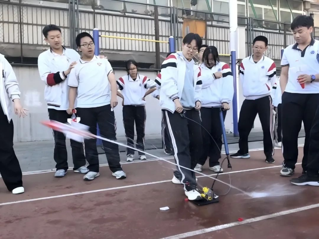当操场变为发射基地时,活动气氛达到高潮。同学们带着“探究水火箭最佳发射角度与最佳装水量”的任务,依次完成发射。每组水火箭在蓝天下划出优美的抛物线,伴随着现场的欢呼声,科技实践的严谨与趣味实现了完美融合。