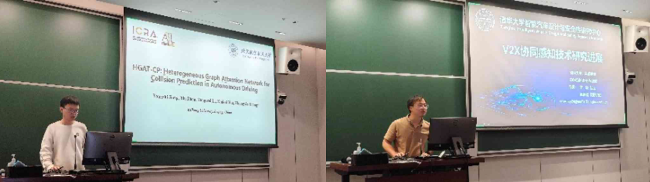 加强党的领导是实现高水平科技自立自强的前提和基础,为推动党建与科研深度融合,与会党员基于所学专业聚焦智能交通、自动驾驶等前沿方向进行分享与研讨。北航交通学院2023级硕士研究生蒋勇智以《HGAT-CP:基于异构图注意力网络的自动驾驶碰撞风险预测》为题进行了分享,他通过图神经网络构建动态交通交互模型,实现多车场景下的风险预判;清华大学车辆学院2024级博士研究生宋致应介绍《V2X协同感知技术》研究的系统性成果,对多车感知融合、低延迟通信机制等关键技术进行了深入解读。分享后,大家针对技术实现路径、模型泛化能力与工程落地需求展开热烈讨论。