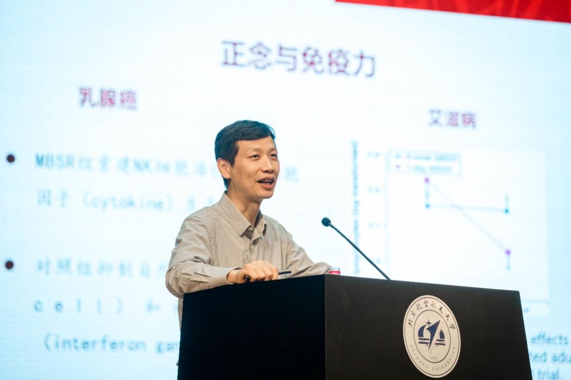 北航新闻网4月24日电(通讯员 陈俣含 冯蓉/文 赵金昊 姜海洋/摄影)4月23日,北京大学心理与认知科学学院副院长刘兴华教授为北京航空航天大学学生开启了一堂特别的“正念训练”心理健康课,帮助学生们通过正念练习有效管理压力与情绪。当天,北航4000余名2022级本科生通过线上线下相结合的方式参与学习。