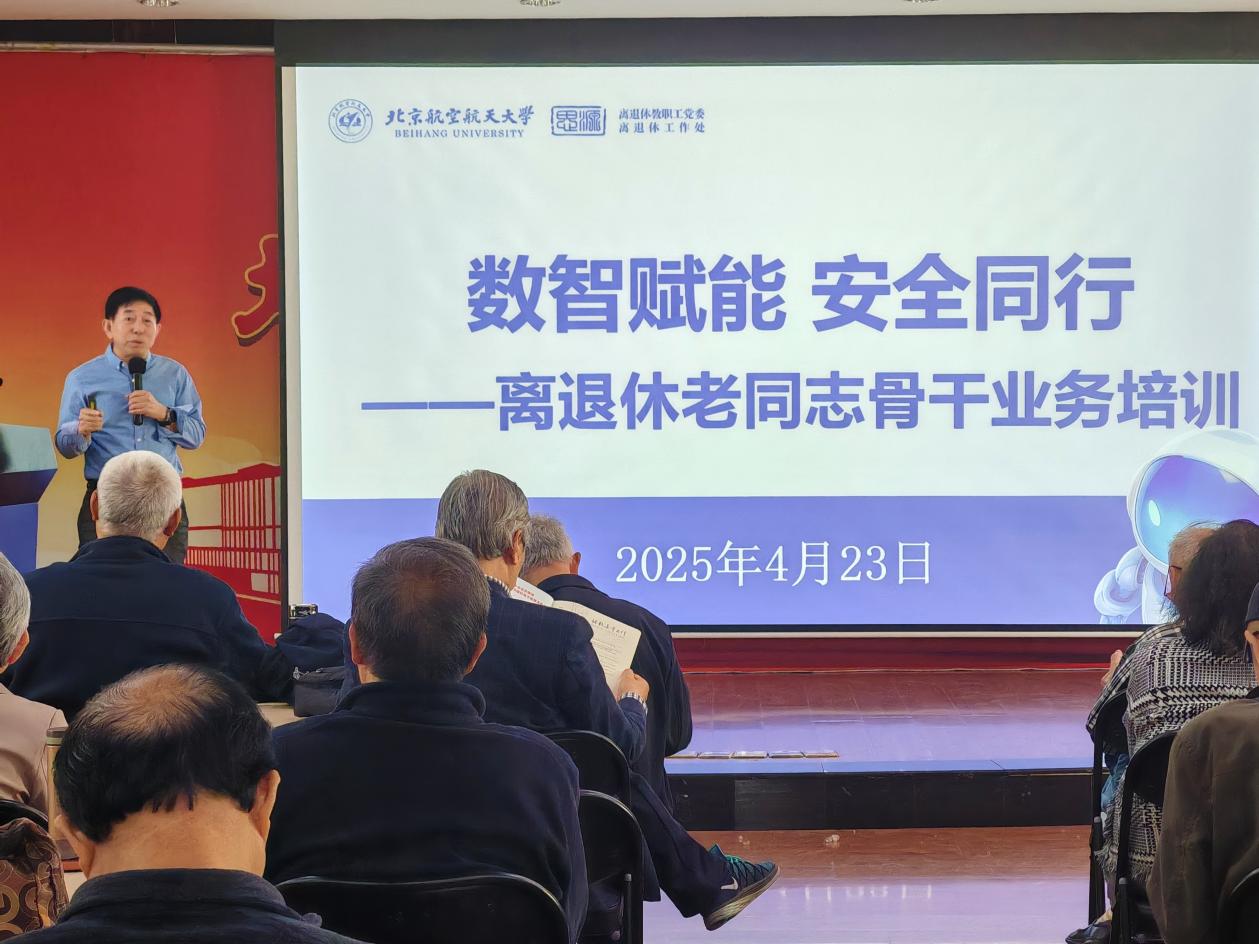 北航新闻网4月27日电(通讯员 张嘉璇)4月23日下午,思源楼二层多功能厅气氛热烈。网络安全与信息化学院退休教授刘连忠应邀走进思源讲堂,为80余名离退休党支部宣传委员以及关工委老同志骨干带来“数智赋能 安全同行”专题讲座。离退休党委副书记、离退休工作处副处长郭永秀主持活动。
