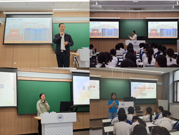 士嘉书院团委书记申永超面向全体来访师生作北航招生主题宣讲。申永超从北航的历史沿革、发展现状出发,系统介绍了学校在“双一流”建设、学科布局、人才培养及科研成果方面的突出优势,重点解读了北航的招生专业设置、大类招生等相关招生政策,帮助同学们建立起对北航的全面认知。之后,首师附优秀校友、现北航2023级学生李佳玥、2024级学生刘可欣以朋辈视角与学弟学妹展开交流分享,围绕高考选科建议、北航大类招生下的专业选择、课程体系与特色培养等方面进行深入讲解。在场学生围绕选科方向、课程学习、校园生活等积极提问,交流气氛热烈融洽。