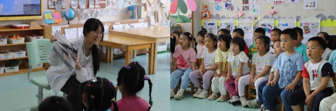 活动伊始,北航幼儿园第二教职工党支部书记刁旭、未来空天学生党支部书记宫凡分别介绍了幼儿园和党支部的基本情况,提醒学生党员活动中的注意事项。在幼儿园的大力支持下,学生党员与各班老师合作,根据儿童年龄层次,在大、中班(混班)和小、托班分别开展知识科普和读绘本活动。