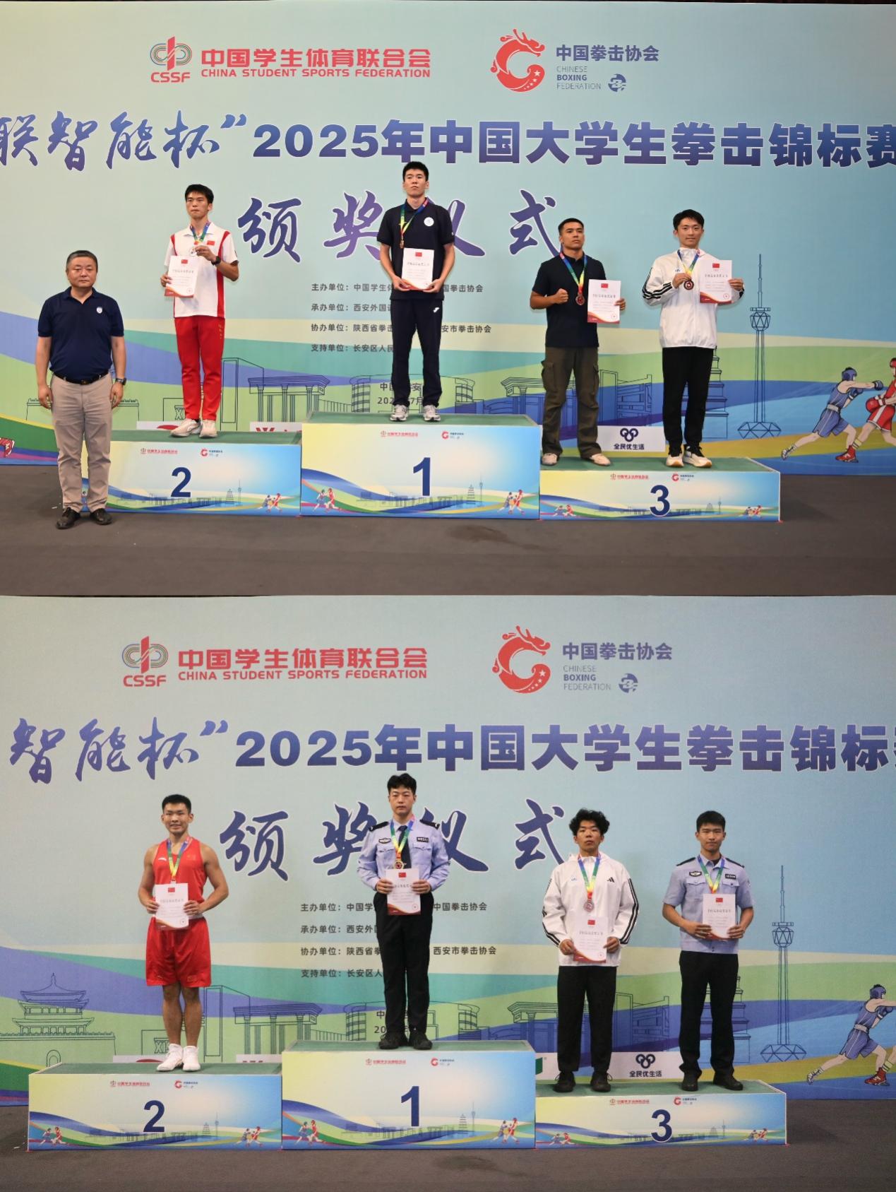 比赛中,航空科学与工程学院陈智盈获得男子65kg级铜牌,飞行学院刘毓疆获得男子80kg级铜牌,飞行学院郄程淇获得男子80kg级第五名,材料科学与工程学院李一翔和交通科学与工程学院唐欣玮获评“优秀运动员”称号,充分展现了我校拳击项目的训练成效与良好精神风貌。