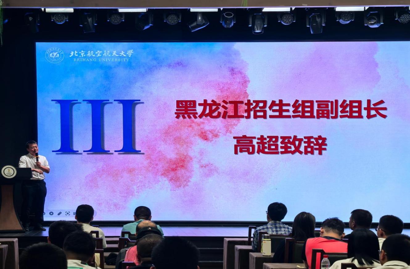 随后,黑龙江招生组副组长高超寄语全体新生,围绕北航“德才兼备,知行合一”的校训和“空天报国”精神内核展开深入分享,他寄语新生三点:明大德是成长根基,新时代北航学子需以爱党爱国为首要准则,将个人发展融入国家航空事业大局,同时坚守私德,杜绝学业投机、摒弃交往计较,方能行稳致远;立大志要突破同辈局限,将个人志向与第二个百年奋斗目标紧密结合,在关键领域深耕突破;成大事需践行“知行合一”,在大学主动把握机遇,夯实课内知识、积极参与科研实践,同时警惕游戏、短视频的过度消耗,让青春在奋斗中绽放光彩。