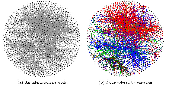 图:社交网络用户的情绪存在聚集现象,即结构上邻近的用户拥有相同的情绪。这里用户的情绪由不同的颜色表示:红色表示愤怒,蓝色表示低落,绿色表示高兴,黑色表示厌恶。